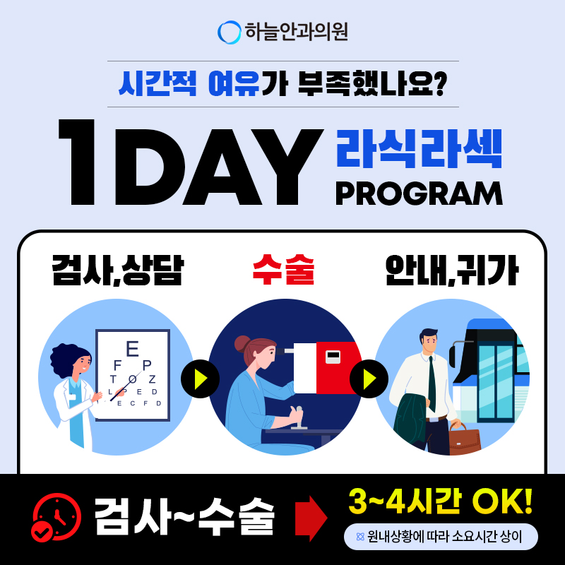 부모님 일정상 자주 병원 다니기 어려워서 원데이 라식 프로그램이 있는 하늘안과가 딱이었어요.
